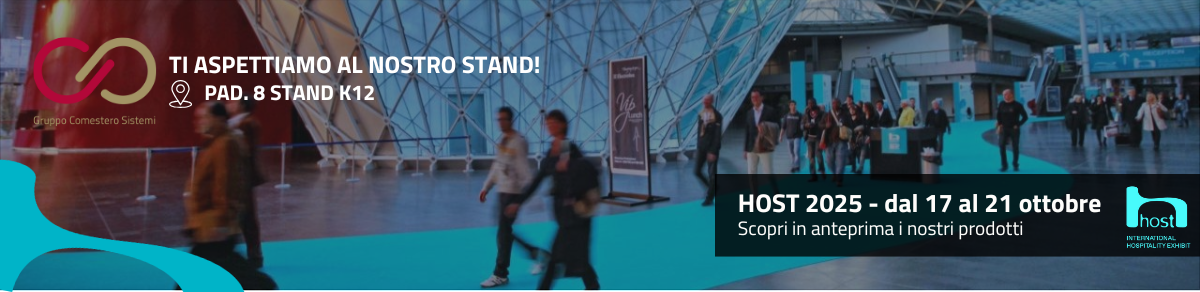 Vieni a scoprire le ultime novità alla fiera HOST MILANO 2025, il nostro team sarà a disposizione per mostrarti le soluzioni Comestero e per rispondere a ogni domanda.